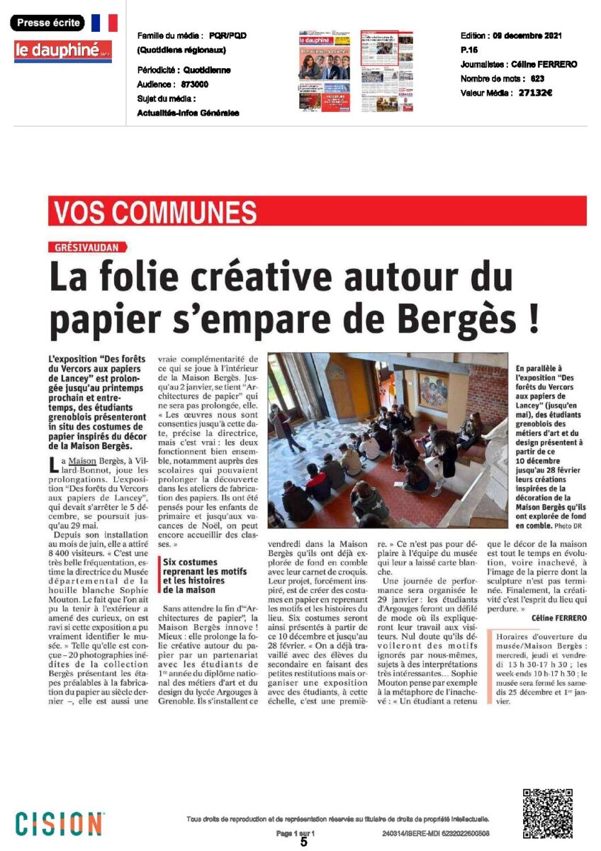 A mi-chemin entre mode et graphisme, les étudiants de 1e année du Diplôme national des Métiers d’Art et du Design (DNMADe – lycée Argouges Grenoble) jouent avec les disciplines et exposent leurs projets inspirés par la Maison Bergès. S’inscrivant dans l’histoire des papeteries de Lancey, leurs créations prennent la forme de costumes de papier où l’éclectisme du décor architectural est transposé sur des surfaces monochromes délicatement assemblées, tissées et découpées. De manière inédite et poétique, ces silhouettes, résolument contemporaines, établissent un dialogue sensible avec l’esprit des lieux. Exposée et mise en scène par les étudiants au cœur de la Maison Bergès, cette collection immaculée est à découvrir sans tarder !