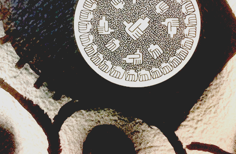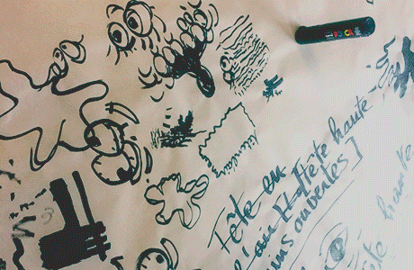 Cette action remarquable est le fruit du travail et de la volonté de ce groupe d’enseignants qui ont démontré clairement, qu’avec quelques mètres de papier kraft, quelques feutres Posca noirs et de bombes aérosol noires le tout pour un budget de deux cents euros, on peut, il suffit d’avoir l’envie et la volonté. Ils ont utilisé la technique du pochoir avec de bombes aérosols et ont relié dans un contraste blanc et noir, les mains et les yeux (tête haute et mains ouvertes) des graphismes à main levée qui leur sont propres, dessinés aux feutres Posca. Ils ont ainsi obtenu un mélange de styles différents et ont exprimé des influences personnelles dans une fluidité étonnante et un accord parfait. Peu de mots, mais de la plénitude.