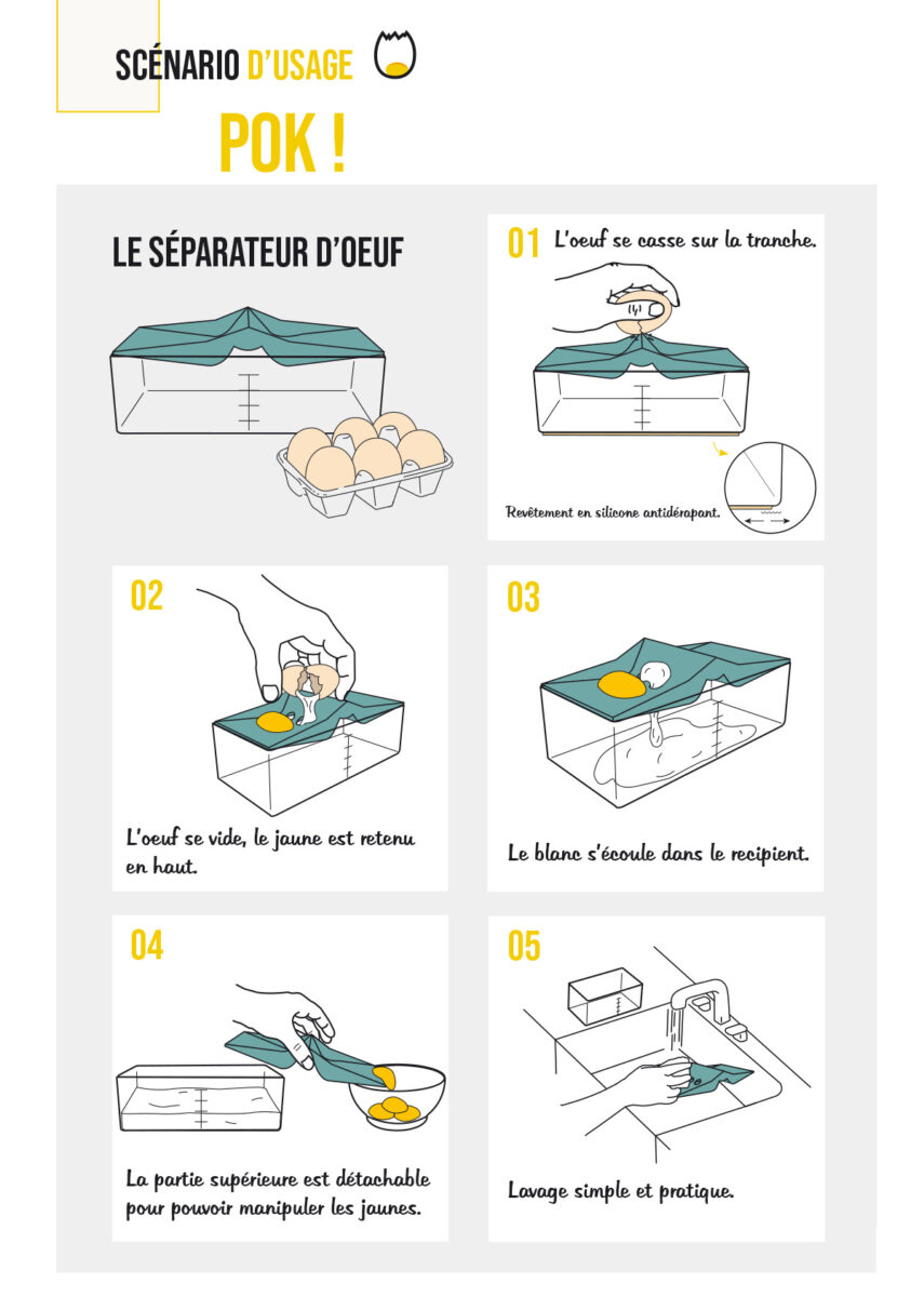 C’est pour cela que POK a été créé : un casse-œuf simple qui permet de casser puis séparer les blancs des jaunes en toute tranquillité. Cette étape simple est cruciale dans la pâtisserie et pourtant si compliqué pour les personnes ne pouvant utiliser qu’une seule main. Grâce à POK, le domaine de la pâtisserie s’ouvre enfin à eux.