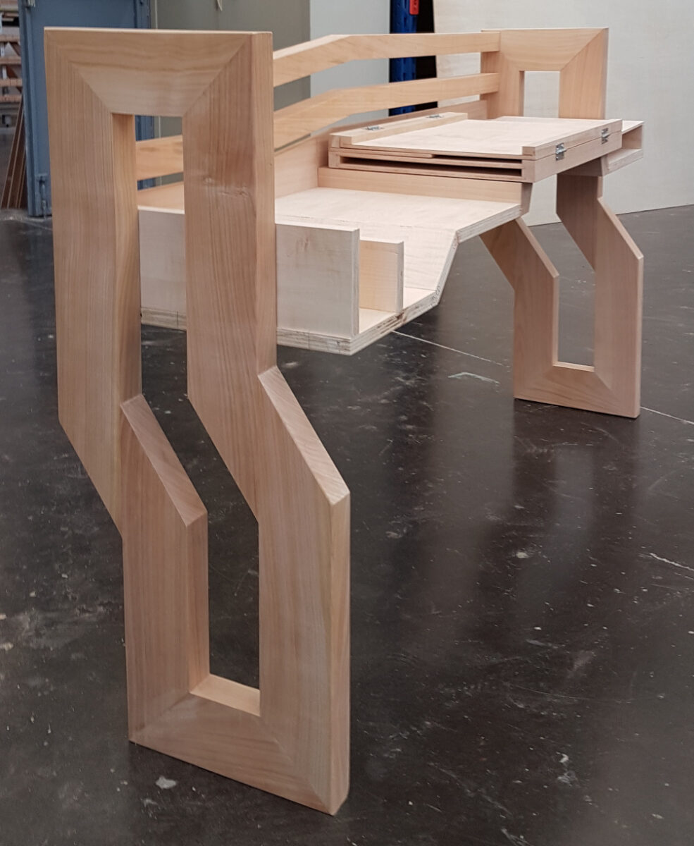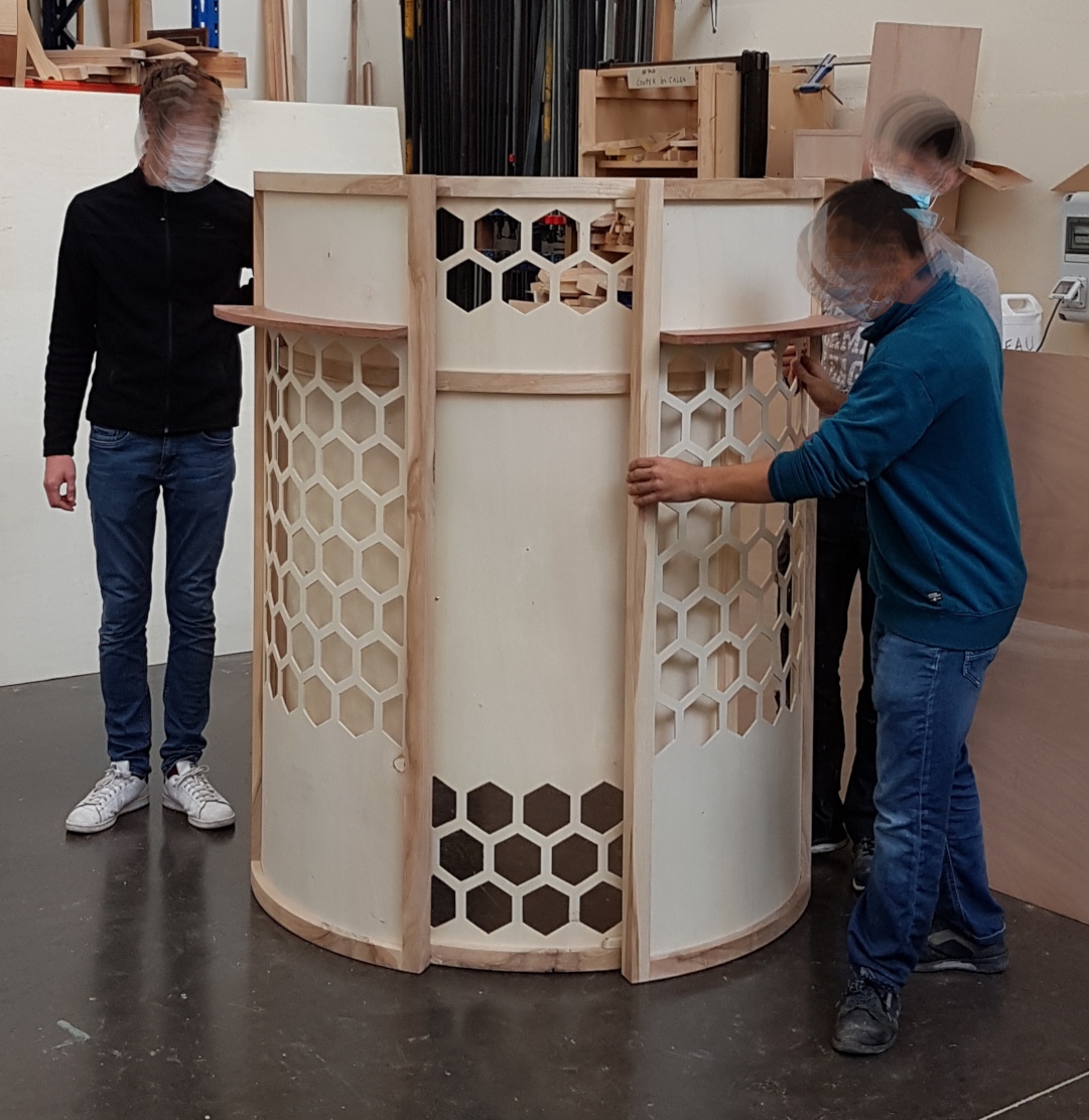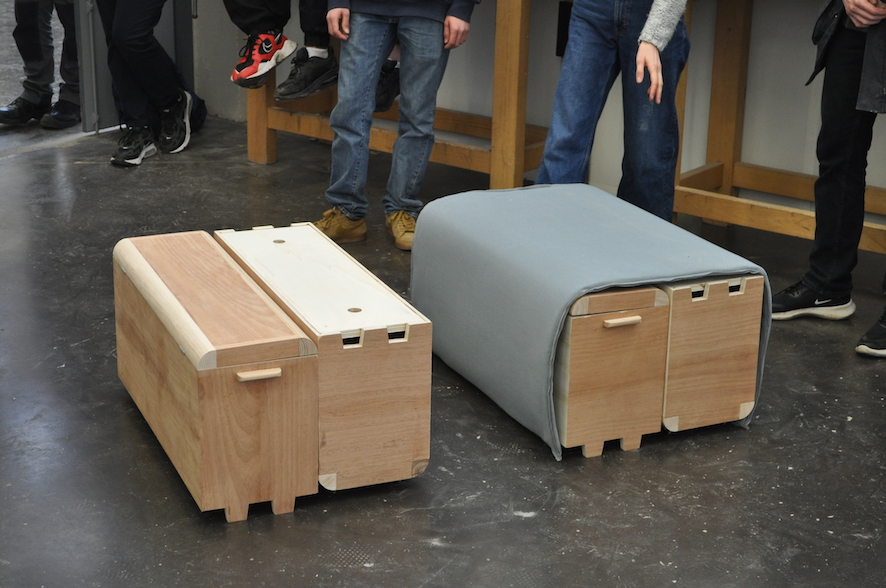 Enfin, le « défi » lié au temps de création/réalisation très court (dix jours), stimule les élèves qui apprennent à s’impliquer sans relâche dans un projet qui demande efficacité et ténacité. Après plusieurs confinements, le projet a été orienté sur l’espace partagé entre télétravail et vie privée. La problématique centrale du partage entre espace « privé » et espace « de travail » s’est imposée dès lors que le travail s’est immiscé dans l’espace privatif. Il s’agissait donc de créer des dispositifs aux scénarii modulables, escamotables, un mobilier offrant un espace de télétravail le jour, disparaissant la nuit au profit d’un autre usage.